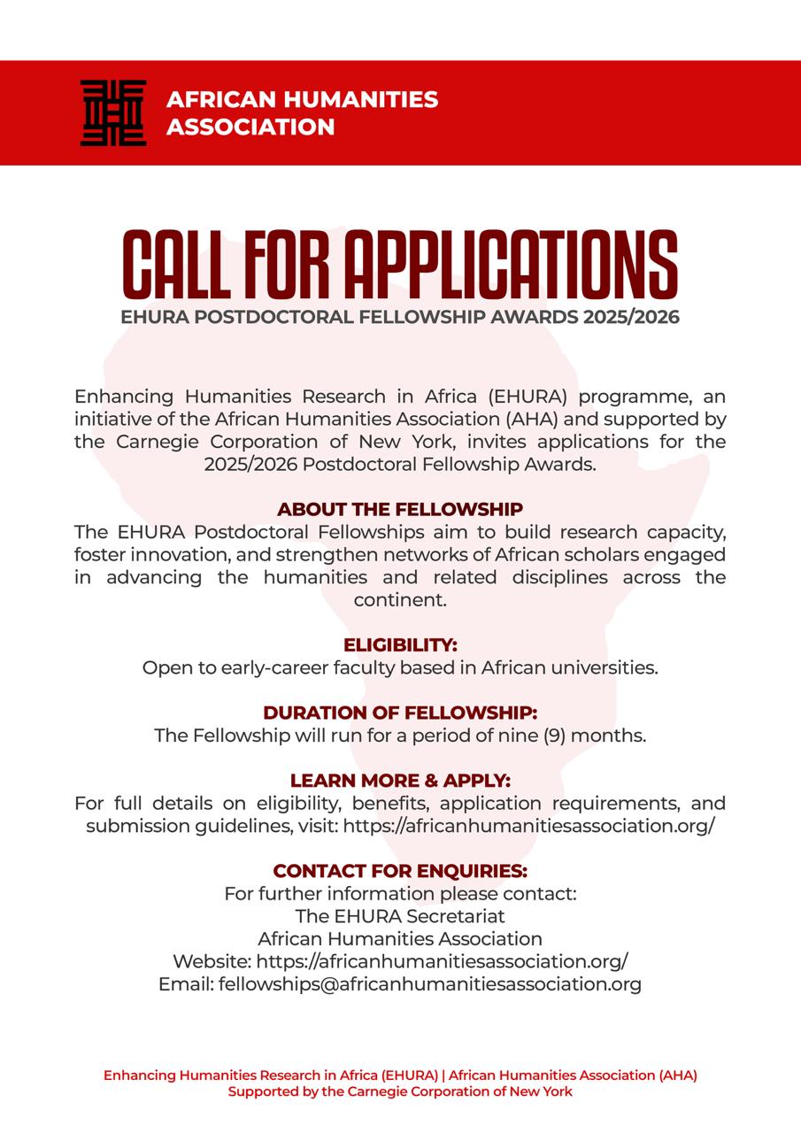 The Enhancing Humanities Research in Africa (EHURA) programme, an initiative of the African Humanities Association (AHA) and supported by the Carnegie Corporation of New York, invites applications for the 2025/2026 Postdoctoral Fellowship Awards. The fellowships aim to build research capacity, foster innovation, and strengthen networks of African scholars engaged in advancing the humanities and related disciplines across the continent. They offer targeted support to early-career scholars pursuing postdoctoral studies, with particular emphasis on qualitative research methodologies in the humanities. Proposals that explore the intersection of artificial intelligence (AI) and African narratives, or that creatively engage emerging technologies in the interpretation, preservation, and dissemination of African knowledge systems, are especially encouraged.