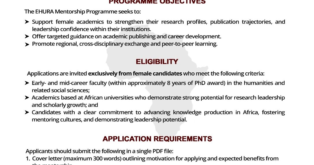 The Enhancing Humanities Research in Africa (EHURA) programme, an initiative of the African Humanities Association (AHA) supported by the Carnegie Corporation of New York, invites applications for the 2025/2026 Mentorship Programme. The Mentorship Programme is designed to support and advance female academics in the humanities and related social sciences by